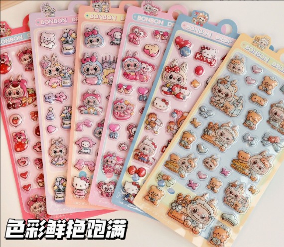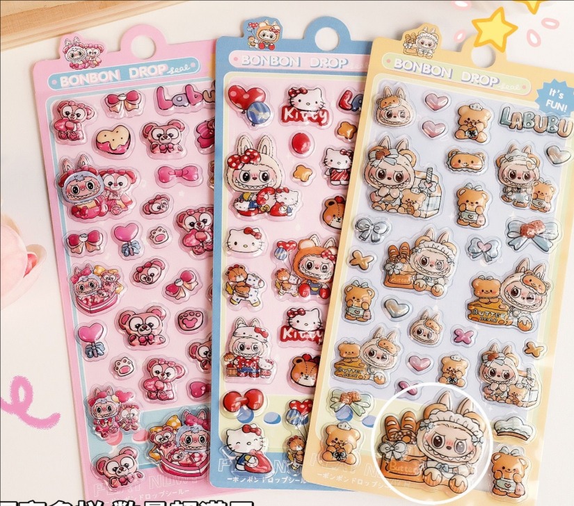 LABUBU 3D立体クリスタルステッカー|かわいい浮き彫りデザイン スマホケース・タブレット装飾用 DIY 手帳デコ シール